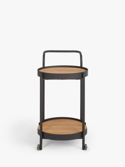 Perfect for outdoor parties, this cart features a sturdy and weather-resistant powder-coated steel frame. The rounded top and bottom shelves are made from naturally weather-resistant FSC-certified acacia wood. This modern and sturdy design comes with two transport wheels, so it's easy to pull it up to the garden table, ready for happy hours and sunset views.